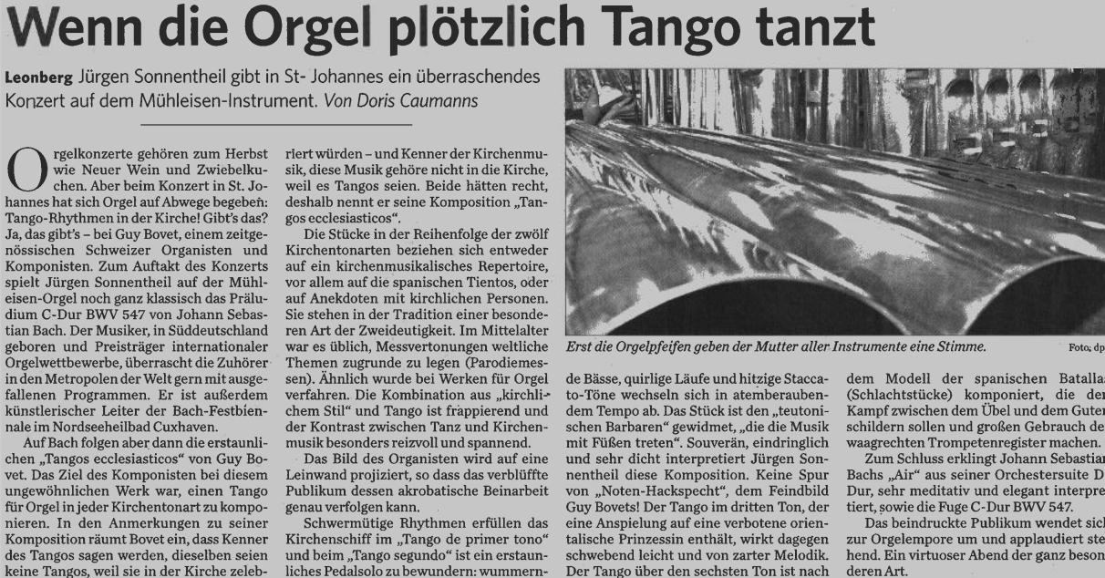 ... Über allem thronte Jürgen Sonnentheil am Orgelpult, er geleitete durch die Komposition und fing die Solisten behutsam wieder ein. Ein Hörgenuss, der um so bemerkenswerter ist, dass die besondere Akustik der Kirche und die weite Entfernung der Instrumente von allen Beteiligten höchste Konzentration erforderte. Und das, obwohl während der Proben das Klavier mehrere Male hochgestimmt werden musste, weil die Orgel auf die hohen Außentemperaturen reagiert hatte. ...