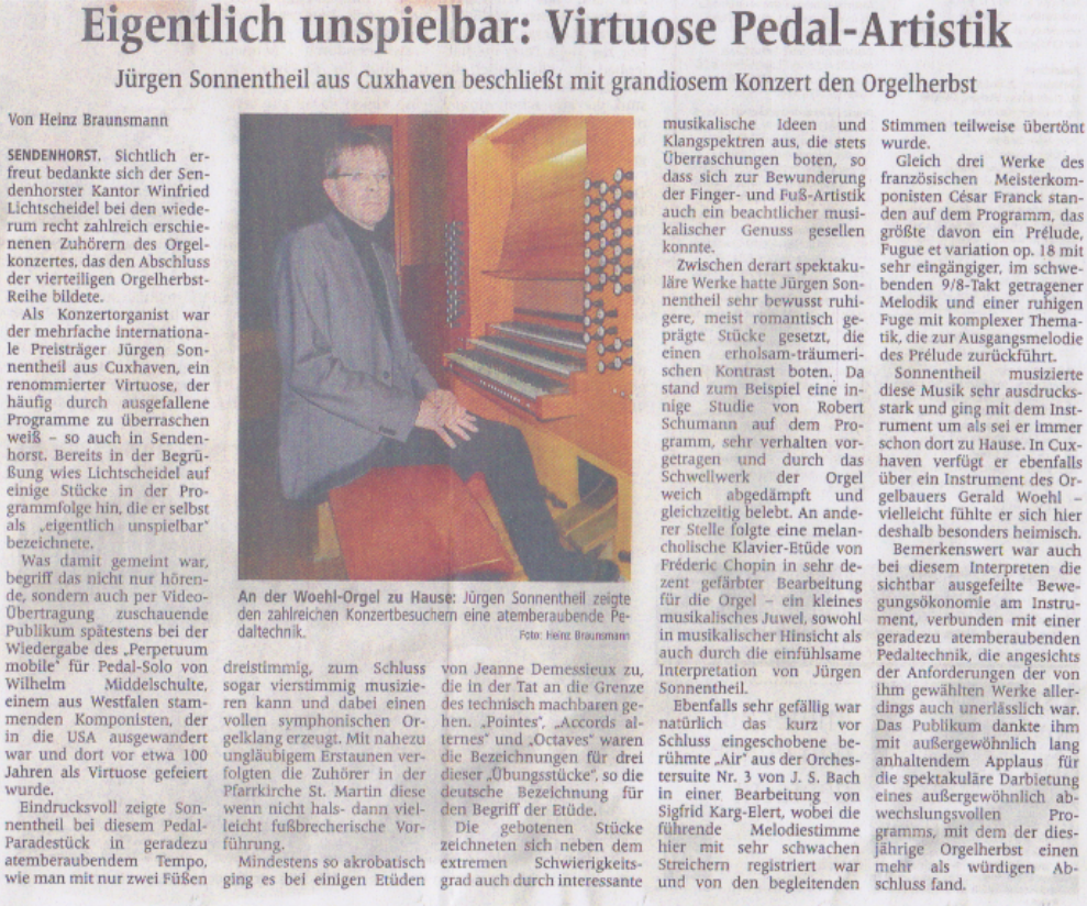 ... Das berühmte „Air“ von Johann Sebastian Bach in einer Bearbeitung von Siegfried Karg-Elert klang andächtig, die durchlaufende Bassfigur im Pedal tropfte quirlig erfrischend, ganz neu beseelt interpretierte Sonnentheil diesen „abgespielten Ohrwurm“, verzögerte hie und da, trillerte dezent und wenig barockig-süßlich. Nüchtern-nordisch, das drückt seine Interpretation wohl am trefflichsten aus. Der in Süddeutschland geborene Organist Jürgen Sonnentheil zeichnet sich für die umfangreiche Kirchenmusik an St. Petri in Cuxhaven verantwortlich. Er ist internationaler Preisträger von vielen Orgelwettbewerben und zeigt durch sein Spiel die unermesslichen Klangmöglichkeiten. Seine Virtuosität und ausgeprägte Sinnlichkeit in der Registrierung hat an diesem Samstagmorgen auch die Zuhörer in St. Martin begeistert. Was das Besondere dieses Konzertes war, das sah man auf der großen Leinwand, das war das Wirken des Organisten im Bereich der Pedaltechnik. Unglaublich, mit welcher Präzision, Leichtigkeit und Gleichmäßigkeit der Organist agierte. Beeindruckend, wie seine Füße über die Pedale in einer Art Jogginglauf unterwegs waren. Von oben nach unten und umgekehrt. ...